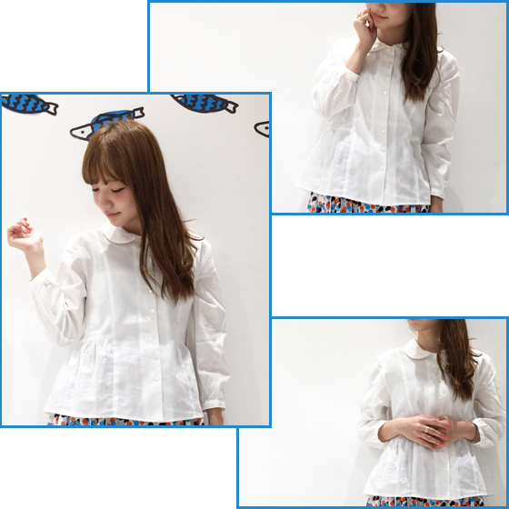 お次はこちら。青衣唯一の柄モノではないお洋服です。青衣のボトムスに合わせやすい、フェミニンシルエットの真っ白な「長袖ブラウス」は、ちょっと肌寒い日も増える(と予想される)梅雨シーズンに重宝しそうですよ♪