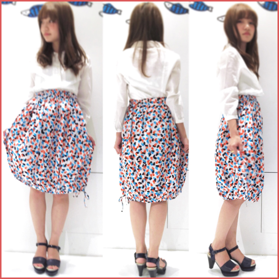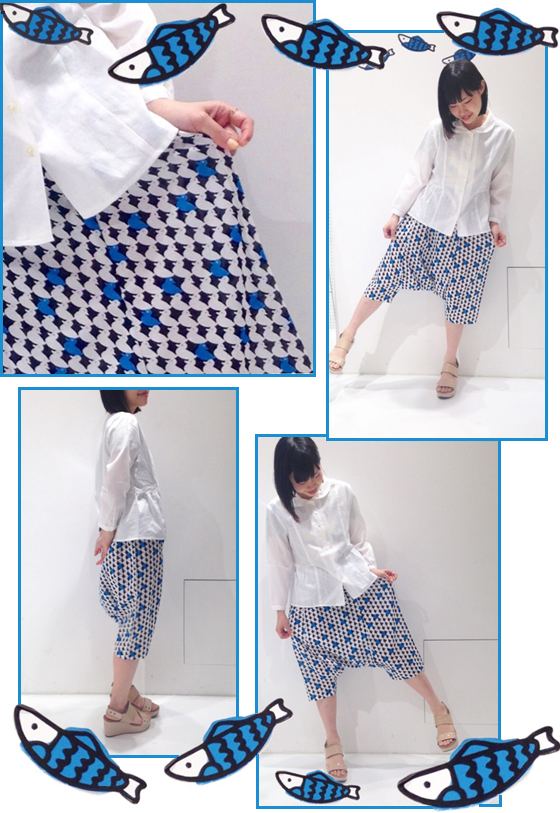 今回のフェアの目玉柄といっても過言ではないお魚柄のお洋服は、この他にもチューリップハットやワンピ、レギンスなどなどございます。なので、上から下まで全身お魚柄でキメる・・るのは、ちょっとやり過ぎ感でまくりでオススメ出来ませんが(さかなくんならイケそうですが)、例えば、チューリップハットとブラウス、バッグとレギンスなど、2アイテム使いなら、1アイテムのみよりもむしろ可愛いかと思います♪ 是非お店でチェックしてみてくださいね☆ もし組み合わせに迷ったら、その時はどうぞお気軽にスタッフにご相談下さい。ファッション好きのスタッフ一同、皆様からのお声がけを、今か今かとお待ちしておりますよ(笑)