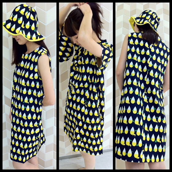 こちらは「キツネの尻尾」柄のワンピースとチューリップハットのコーデです。両端のワンピは「クルーネック袖なし」のタイプで、中央は「衿付き半袖」のタイプです♪ 雨の日のお出かけも、このワンピなら、気分よく出かけられること間違いなしですね☆
