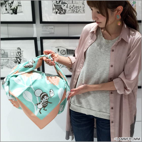 ご覧ください。かなり大きなものを包んでも余裕の大きさがありますよ。ラムフロムでオチビサングッズを大人買いして、この風呂敷に包んで帰るというのは如何でしょうか? るんるん気分で帰れると思います☆