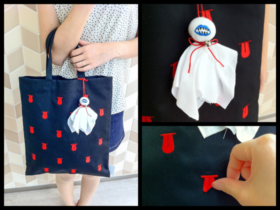 こちらは「のっぺら小僧」トートバッグです。もう見るからにインパクト大ですが、このバッグに先ほどのてるてる坊主をアクセサリーとして付けると、インパクトはMAXになります。赤い舌がひとつだけ本物のようになっているのが特徴的なバッグでございます。