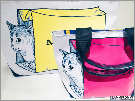 狭い箱や紙袋に入りたがる猫は世界共通のようですニャ。動物の飼料袋に使われている絵やベトナムの広告をリメイクデザインし、それを屋外広告や垂れ幕に使われる素材にプリントした、とってもカラフルポップなバッグ「Banner Bag」シリーズから、紙袋入りニャンコをモチーフにしたバッグですニャ♪