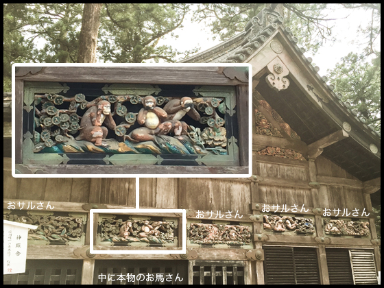 まさかこの写真が役立つ時が来るとは思ってませんでした! 最後はわたくし中の中の人@LAMMFROMMより、この夏日光東照宮にて撮影した「三猿」のおまけ写真で終わりたいと思います☆(実はこの時来年の干支が申だとは全く気づいてませんでした) 「三猿」って、猿の出生から出産までを描いた作品の一部だったんですね・・。ちなみにこの猿の彫刻の下には「神厩舎」があり、なんと本物のお馬さん(神馬)がおります(時間限定で)。なんでも、猿は馬を守り世話をする存在とういことで、メインはおさるさんではなく「お馬さん」だったんですね〜。全く知りませんでした。。皆さんもぜひ、来年、申年の年に訪れてみてはいかがでしょうか♪(お坊さんトークも面白かったですよ)