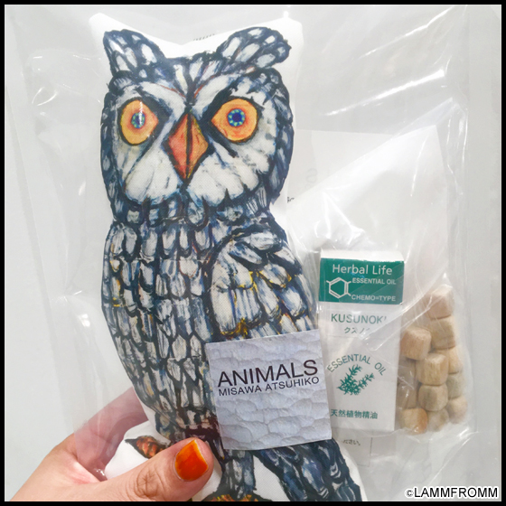 こちらはミミズクのタイプです。精油も付いてますので、香りが弱くなったら、クスノキのブロックに再び精油を塗って下さいね♪